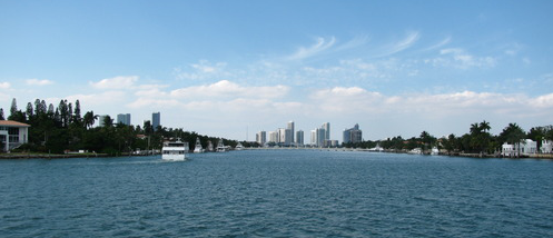Then we cut to Morale’s boat where Crocket and Tubbs are attempting to work a deal. When we first see the boat in the establishing exterior shot, it is anchored in the bay off of the Southwest tip of Star Island. The MacArthur Causeway and the Gantry cranes at the east end of Dodge Island are seen in the background.