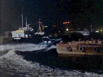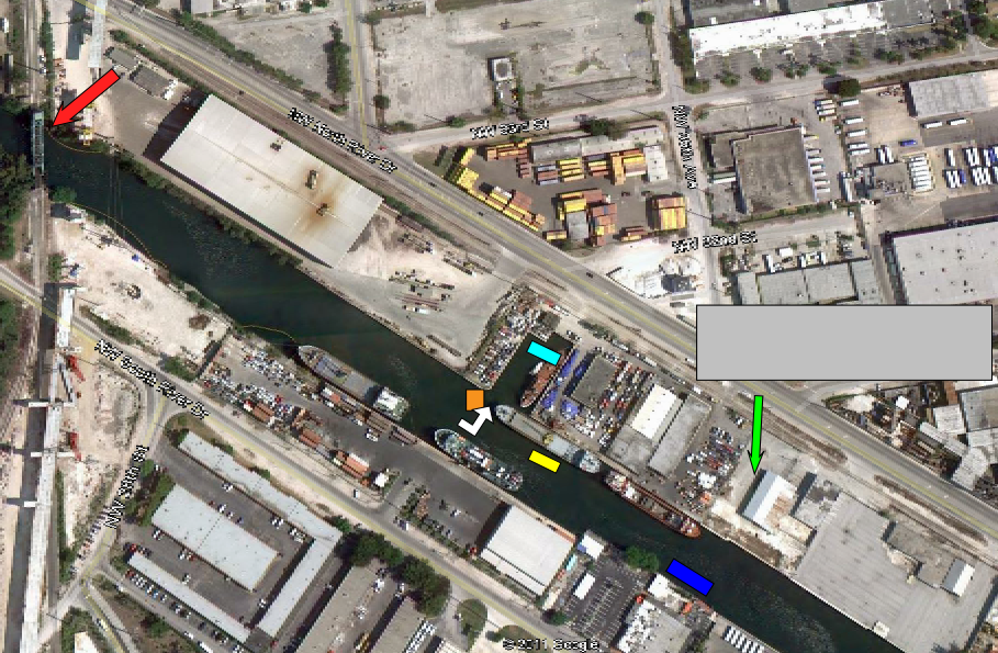 Crockett leaves westbound toward the dead end and the railroad bridge is again seen in the background. We see the same barge again.