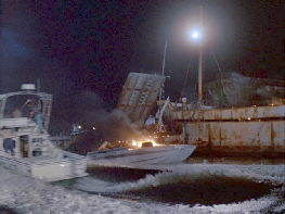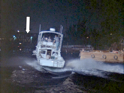 The junk boat is blown and the pursuit starts, westward toward the dead end of the railroad bridge just yards away.