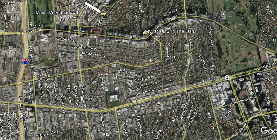 Then we see the sunrise over a not so Miami looking neighborhood. Thanks to the crew of Vice fans at Miamiviceonline.com we now know that this was flmed in Westwood California. The camera was located at the Park Westwood Towers, 969 Hilgard Avenue, Westwood. It shoots eastward toward Wilshire Blvd.
