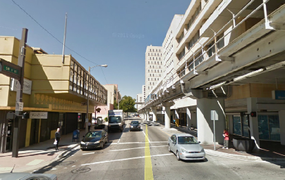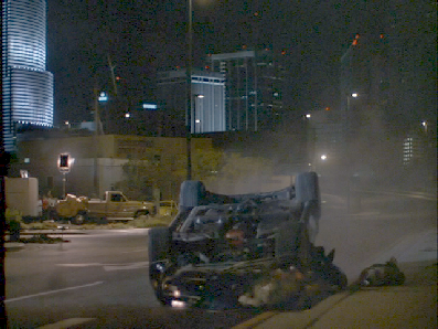Then we see them at the dead end of SW 6th Street by SW 1st Avenue. We have seen this location used in several episodes of Burn Notice. Episode 2, Identity where Michael shoots out the tires on the police car at the nightclub and episode 38, A Dark Road where they crash the cars here. We also see it used in All About The Benjamins for a rocket attack.