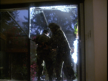 Goof: They smash the window in the sliding glass door to gain entry but the door clearly slides as they hit it showing it was not locked and would have slid open had they tried.