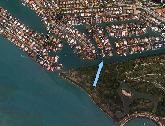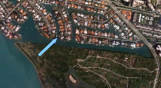 Then we cut to Vasquez’s boat. This was filmed at 1090 Mariner Drive on Key Biscayne. In the canal on the west border of the property that runs north between Mariner Drive and Harbor Drive to the west.