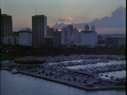 The episode starts with a couple of nice panoramic shots of Miami. First we see the sunset beyond downtown from over Crockett’s marina (S1+S2). Then we see Miami from Dodge Island/Port of Miami.