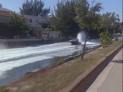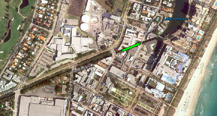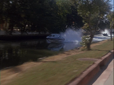 The boat jumps from the Canal onto Collins Avenue at 24th Street where it skids across Collins and slows to a stop on 24th Street.