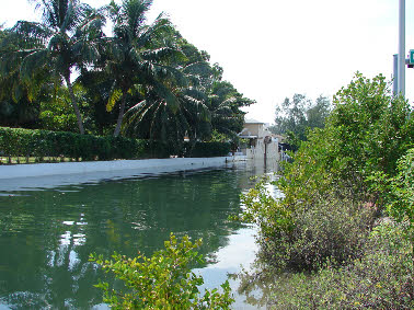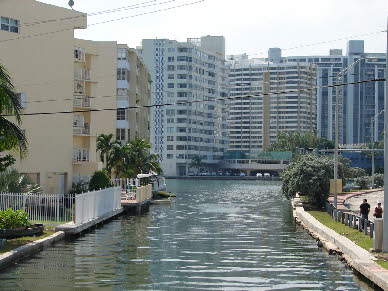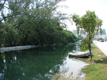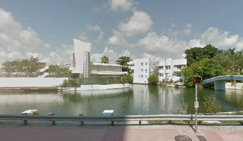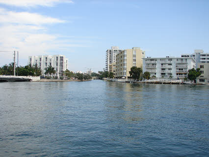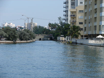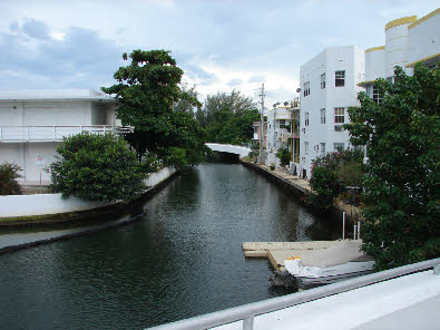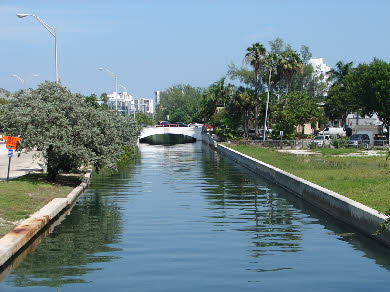 Then still eastbound in the canal, now going away from The 23rd Street Bridge. They are headed toward Lake Pancoast and Collins Avenue. They pass under the pedestrian bridge that links Liberty Avenue on the south to Flamingo Drive on the north.