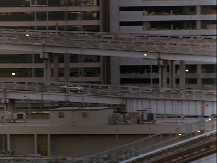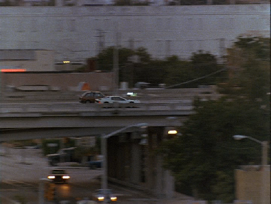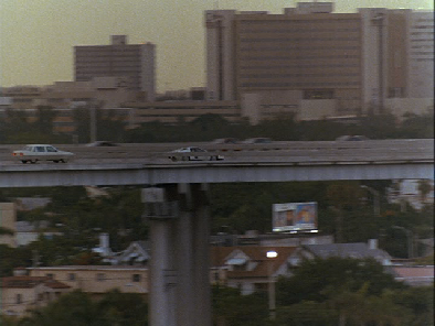 Then we see a nice panning shot of the Testarossa headed north on Interstate 95, crosses the Miami River and then exit into Downtown Miami. This was filmed in one continuous shot with a strong zoom lens. This was filmed from the Washington Mutual Building located at the intersection of SW 1st Avenue and SW 9th Street.