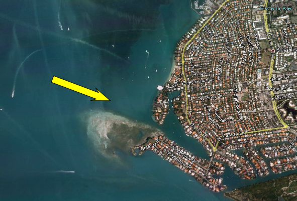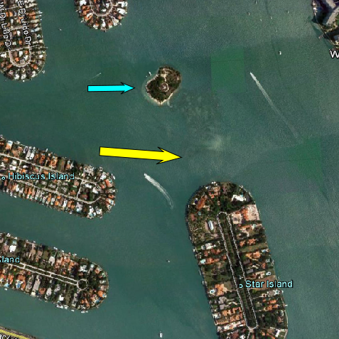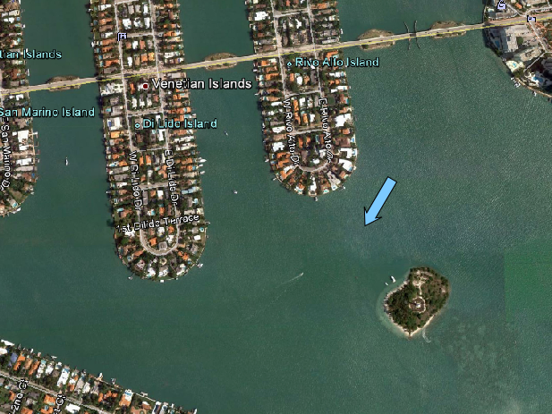 Then a third boat enters the chase. They don’t intend it to be a third boat but it is. It is Sagot headed north around Belle Isle and under the furthest east bridge of the Venetian Causeway. This film is from episode 36, One Way Ticket.