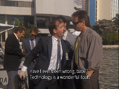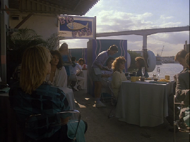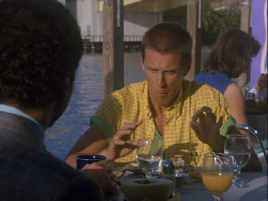 Then we see the trio aboard Crockett’s boat, This may have the look of the Miami River, but it is not. This was filmed on Biscayne Bay by Belle Isle. Where we earlier saw the chase seen filmed.