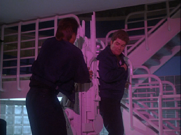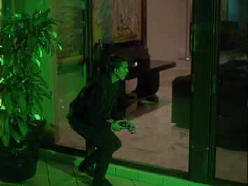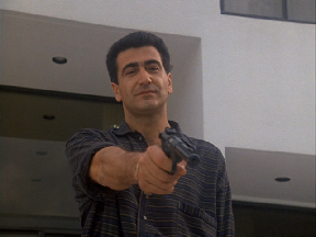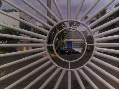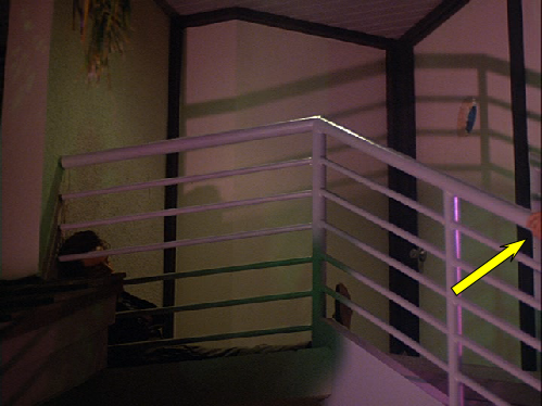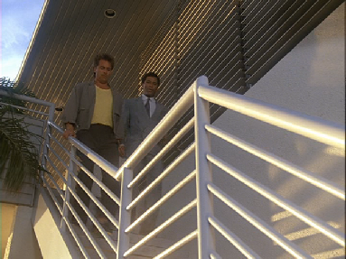 Goof: When they arrive they look up and see Miguel dead by the front door. We also see someone’s hand enter the picture on the railing. Tubbs and Crockett are still down stairs and Duddy is inside while Dykstra and his goon are entering thru the back. This hand should not be there.