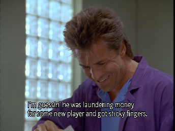 Symington leaves the party so C+T have to break off and follow him back to his apartment. While there, they see Symington go a long way down. Luckily the ground is there to break his fall and this leads Crockett to one of his quintessential lines: “ It ain’t the bluebird of happiness.” This was filmed on location at 1000 Venetian Way. We previously saw this used in Heart of Darkness as the location of Artie’s pad and the pool where Penny is found dead.