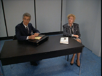 We then see Crockett talk with Christine in the interrogation room. A set at Greenwich Studios.