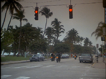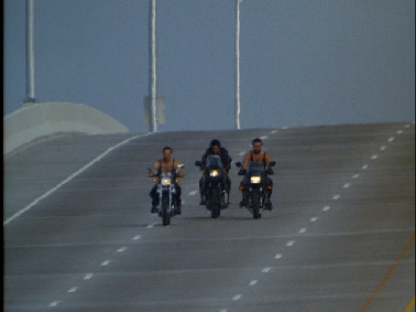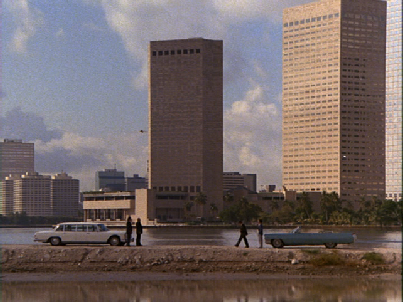 Intercut we see the bikers arriving across the water on the Rickenbacker Causeway. Not a realistic shot at over 800 yards with the equipment he was using.