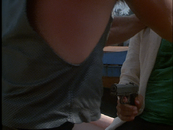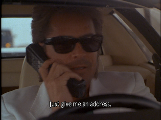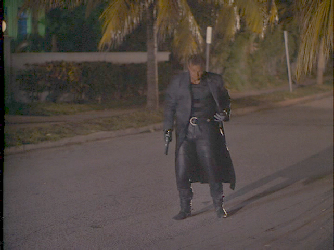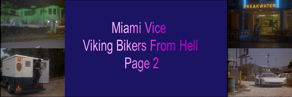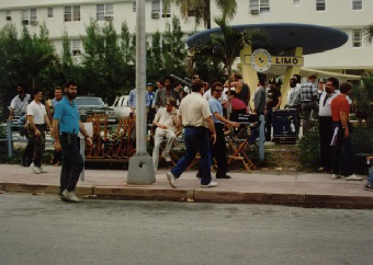 Then we go back to Tubbs who shoots Reb but Reb has a vest on. Reb then shoots Tubbs. Filmed on location at the front of 3650 Flamingo Drive, Miami Beach.