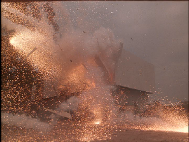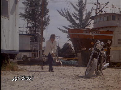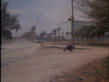 Crockett runs past Reb’s pristine bike and then as the fight continues he runs onto the ship and Reb’s bike is seen in the background burning. Apparently they cut the reason for this out of the final version so it makes no sense to anyone who notices it.