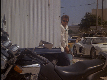Then we see Crockett parked. It appears that he is on 5th Street in Miami Beach by Collins Avenue but not enough is seen to confirm that is the store that we see behind him. Location unknown.
