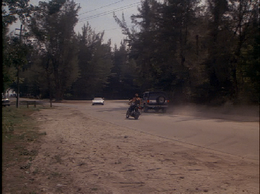 Then inexplicably, it is light out and we see Reb traveling south down No Name Road toward Jimbo’s and their hide out. Over the past years the road has been allowed to grow over with vegetation. In the real world this would not make sense as Reb is traveling from the dead end of a dead end street. This road will look familiar to fans of the movie, 2 Fast 2 Furious which filmed on this road and at Jimbo’s.