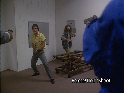 Don Gallego tries to escape out the back but Crockett grabs him.