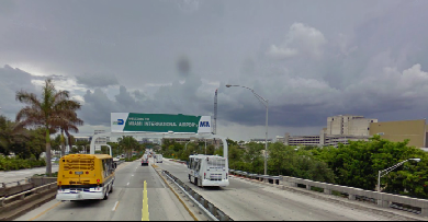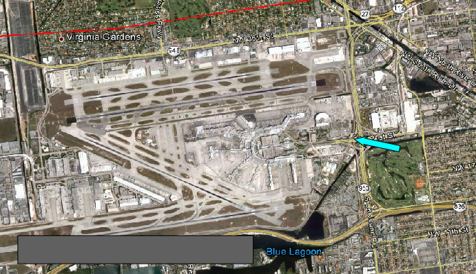 Then we cut to Miami International Airport. They arrive westbound on NW 21st Street.