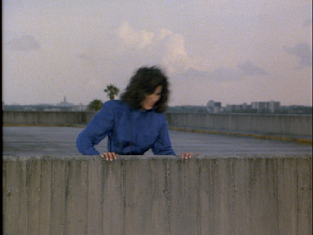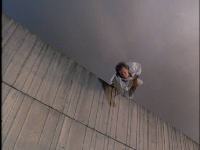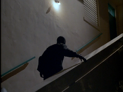 Then we see the stunt double fall over the wall. Gina comes rushing up to the wall and we can see the Biltmore Hotel in the distant background.