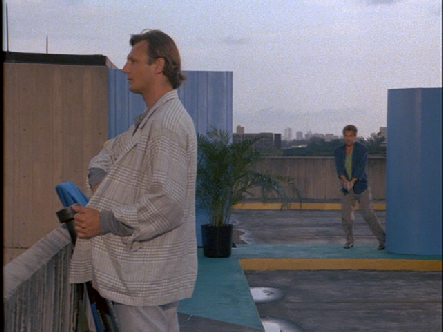 Then it cuts to Carroon atop the Pan American parking garage at Miami International Airport. We see this same background from a different angle in episode 29, Tale of The Goat where Crockett and Tubbs meet Legba’s coffin at terminal D.