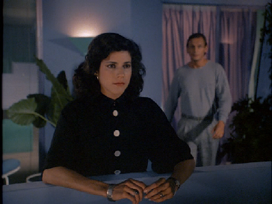 Then we go to Sean’s hotel room (Barcelona Hotel) where Gina cannot get control of herself and has to leave. Then we see Cross in his hotel room (studio set), call Sean and warn him off the beach.